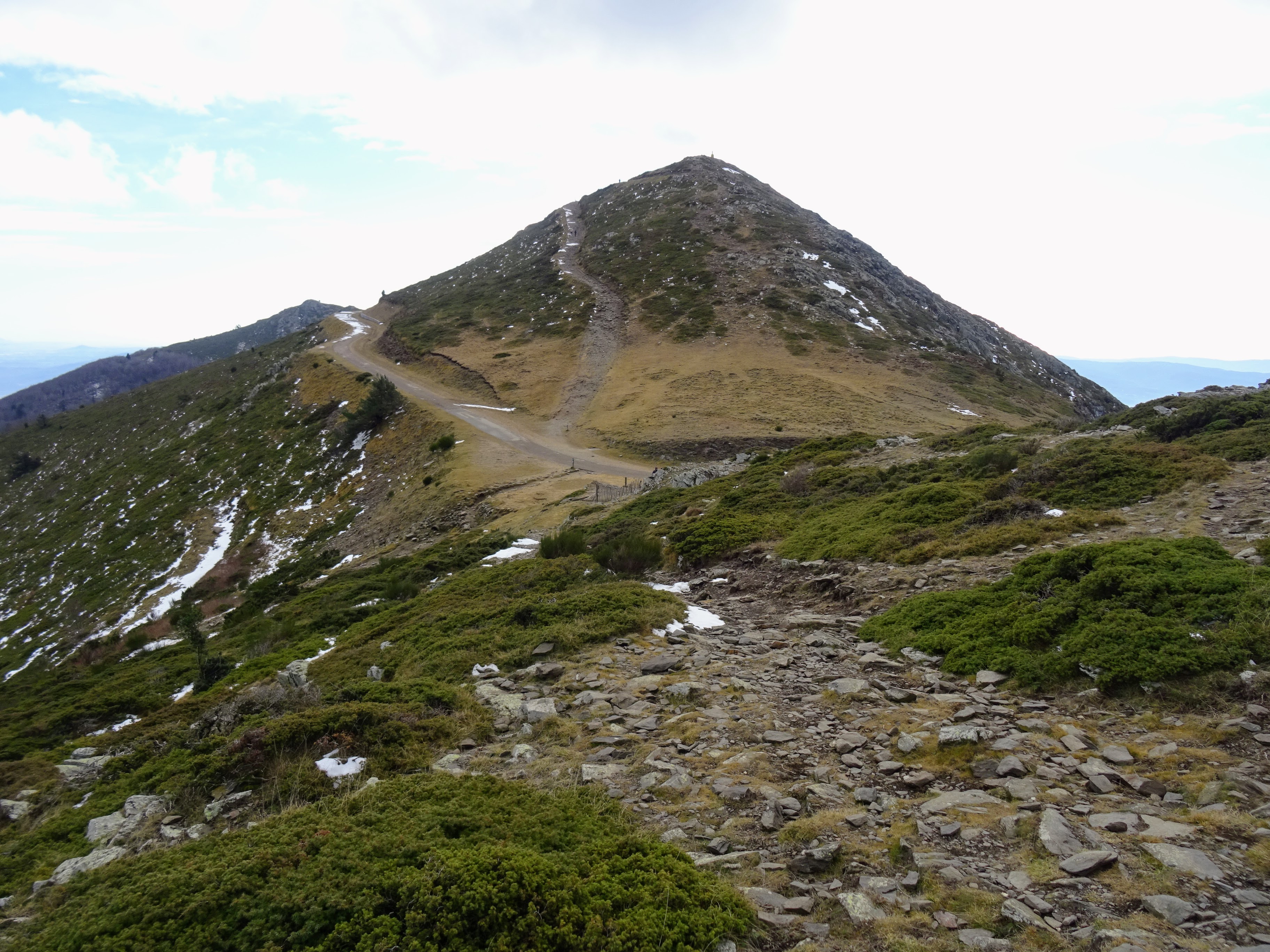 Tampoco me quedo mucho rato en la cima del Turó de l'Home ya que el viento es aquí más fuerte que en Les Agudes, el tiempo justo de unas fotos y para abajo. La bajada la hago siguiendo el GR 5.2 que sale del Coll Sesbasses y baja hasta la Plana del Coll. A pesar de ir por la solana aún se mantiene bastante nieve, dura en algunos tramos, por lo que hay que bajar con cuidado de no resbalar. Una vez llego al desvío del sendero de subida, rehago un poco la fita que lo marca y continúo de vuelta al aparcamiento, que encuentro igual de vacío que a primera hora.